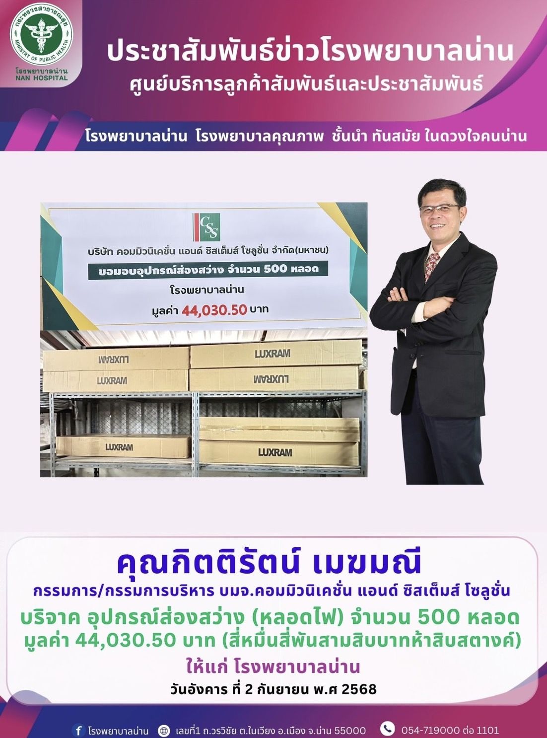 เมื่อวันที่ 2 กันยายน 2568 ที่ผ่านมา บริษัท คอมมิวนิเคชั่น แอนด์ ซิสเต็มส์ โซลูชั่น จำกัด(มหาชน) โดยคุณกิตติรัตน์ เมฆมณี กรรมการ/กรรมการบริหาร บริษัท คอมมิวนิเคชั่น แอนด์ ซิสเต็มส์ โซลูชั่น จำกัด(มหาชน) ได้มอบอุปกรณ์ส่องสว่าง จำนวน 500 หลอด มูลค่า 44,030.50 บาท ให้กับโรงพยาบาลน่าน ทั้งนี้เพื่อให้ทางโรงพยาบาลนำไปใช้ประโยชน์ต่อไป